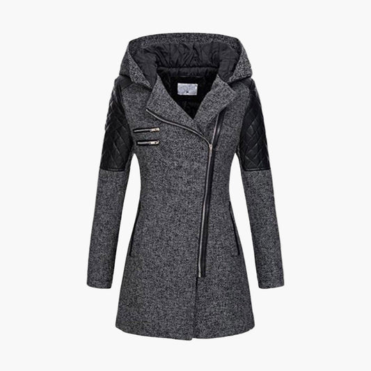 Dam – Elegant Tweedkappa med Huva och Skinnimitation – Vinterjacka för Stad och Fritid