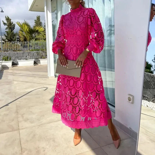 Dam Spetsklänning Midi Elegant Festklänning med Puffärm och Hög Krage