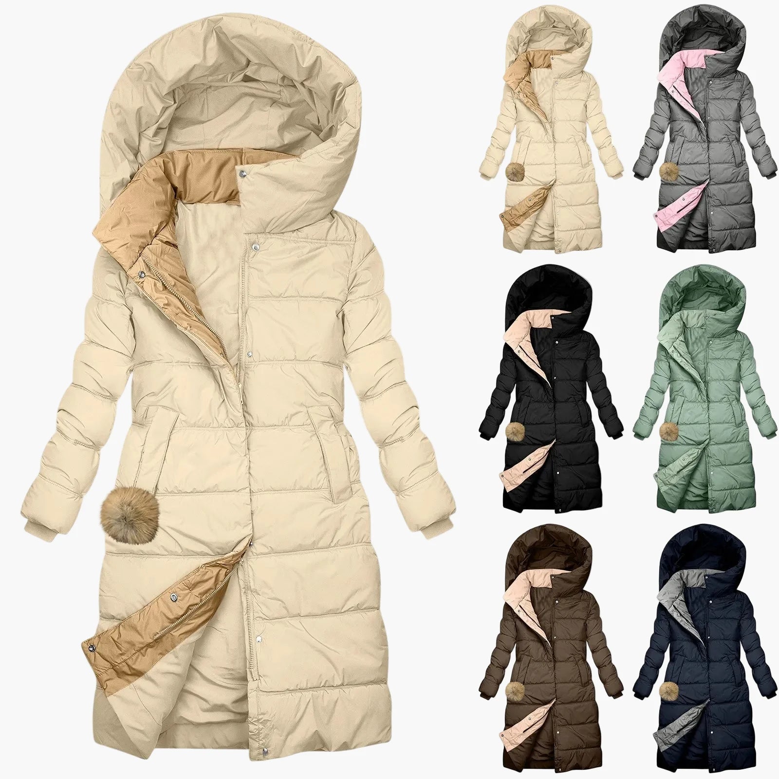 Dam lång vinterjacka med huva – Varm, quiltad och vindtät pufferkappa för vardag och fritid
