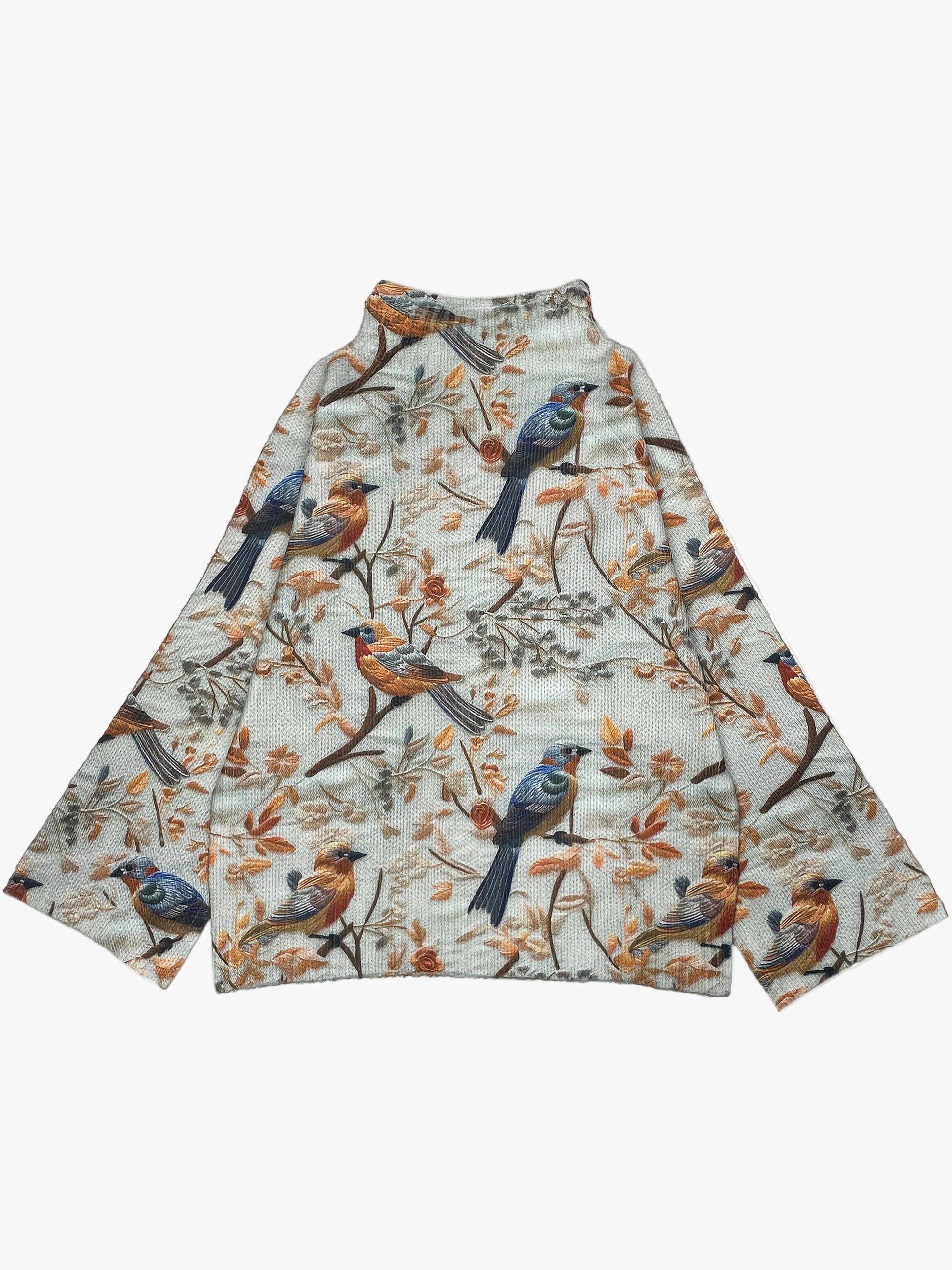 Damstickad tröja med fågelmotiv och hög krage – elegant vardagsmode