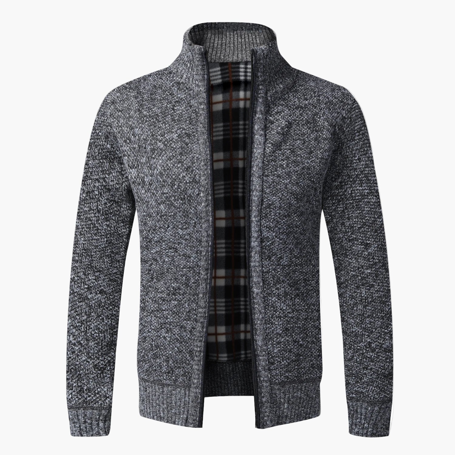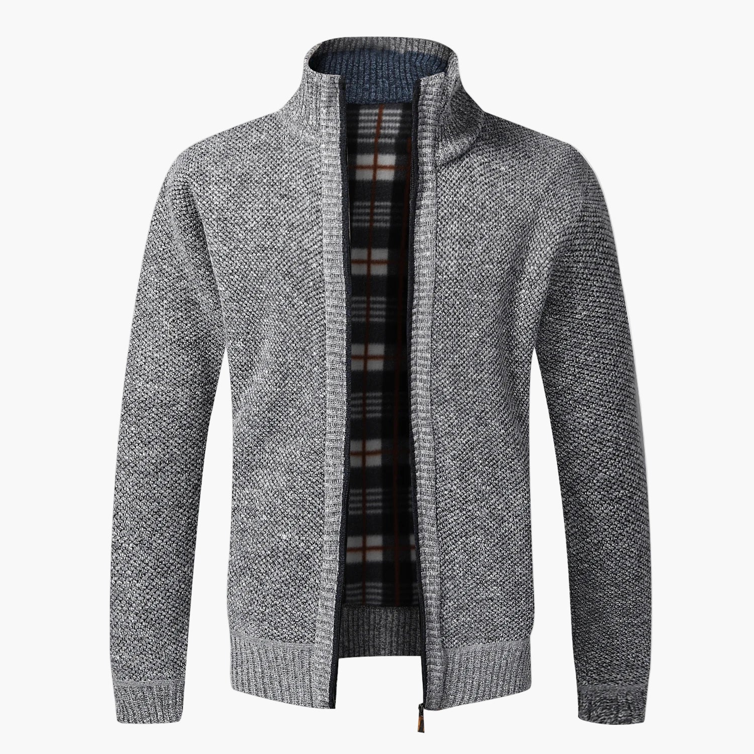 Upptäck den perfekta balansen mellan stil och komfort med denna herrstickade cardigan med dragkedja. Den eleganta designen med uppvikbar krage och klassiskt rutigt innerfoder ger både värme och en modern look för kyliga höst- och vinterdagar. Perfekt för både arbete, fritid eller promenader i stan – denna jacka kompletterar din garderob och passar utmärkt att bära som mellanjacka eller över en skjorta. Den diskreta stickade strukturen ger en exklusiv känsla och den praktiska dragkedjan gör jackan enkel att ta av och på. Ge din stil en uppgradering och njut av värmen under säsongens kallare dagar!
